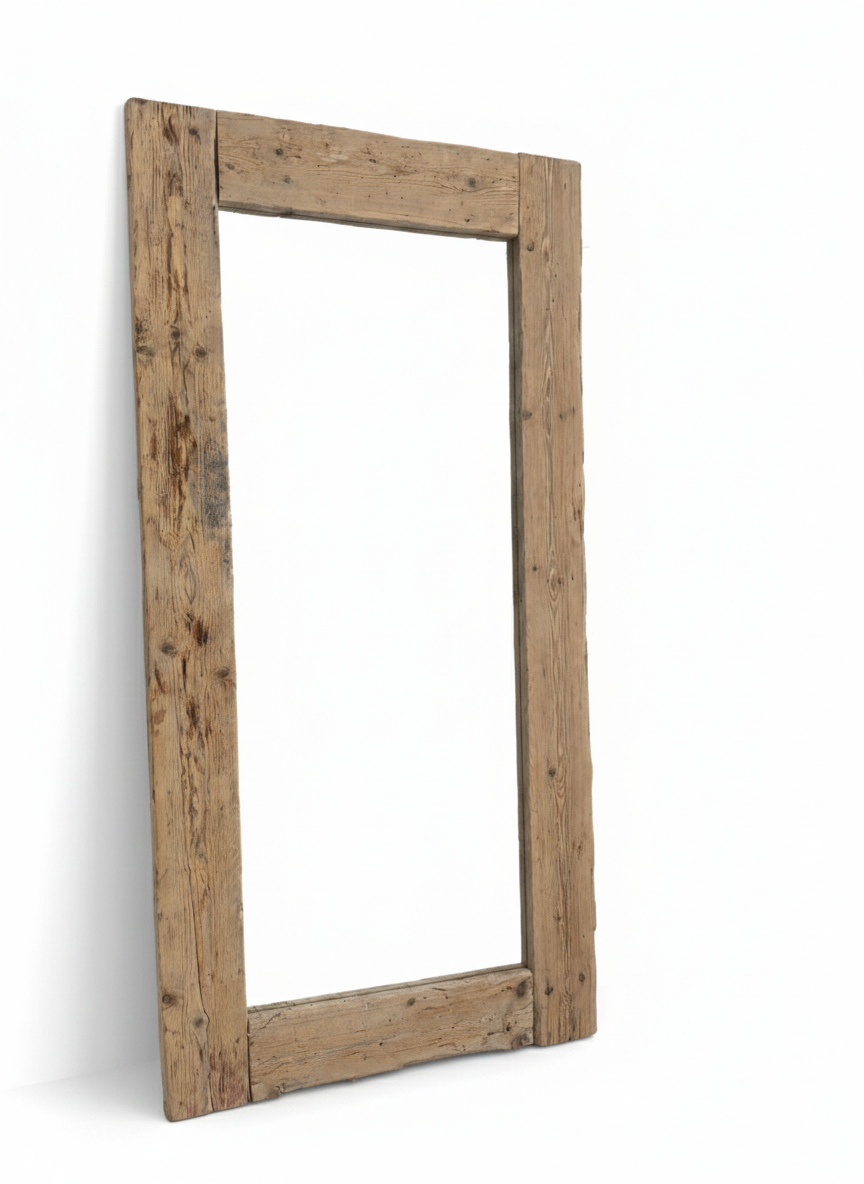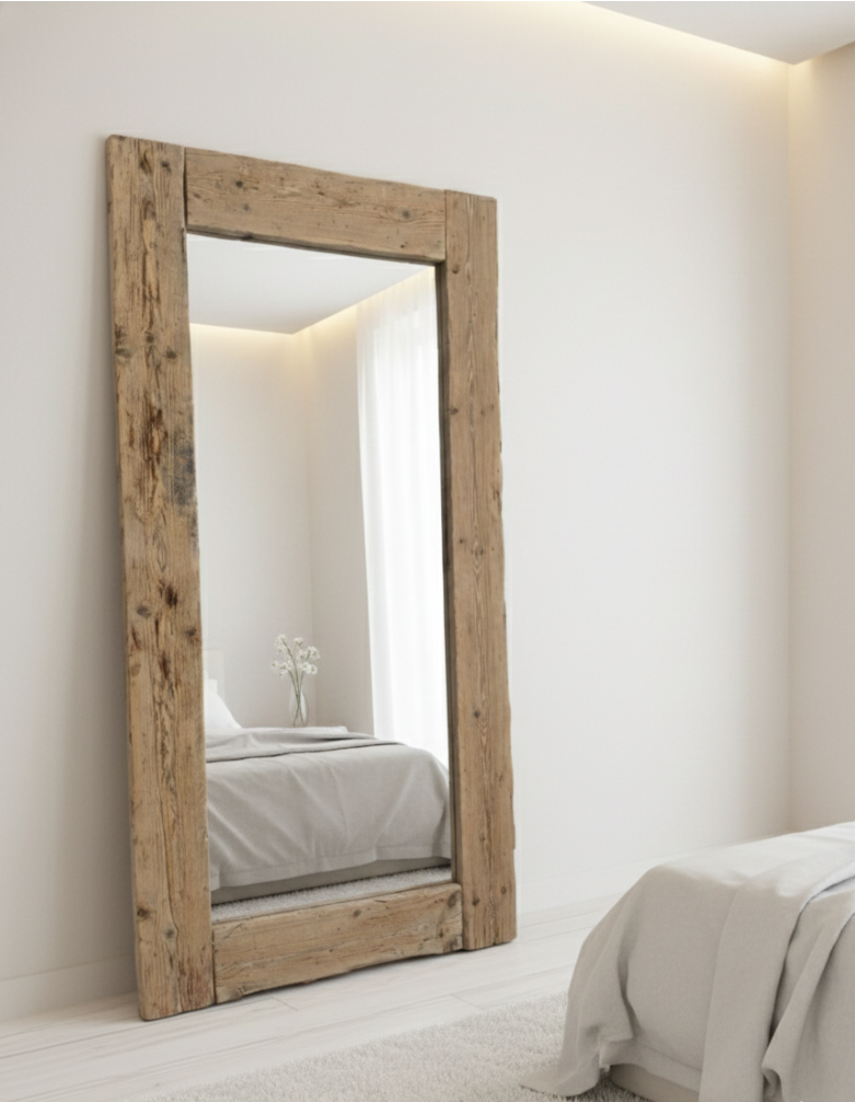 הכניסו את החמימות והעומק של הטבע לתוך הבית עם מראה מלאה בנוכחות. המראה הזו היא לא רק פריט פונקציונלי, היא יצירת אמנות אקולוגית. המסגרת עשויה מ-100% עץ ממוחזר שנבחר בקפידה, מה שמעניק לכל מראה טקסטורה ייחודית, חריצים טבעיים וגוונים עמוקים שלא ניתן לשכפל.